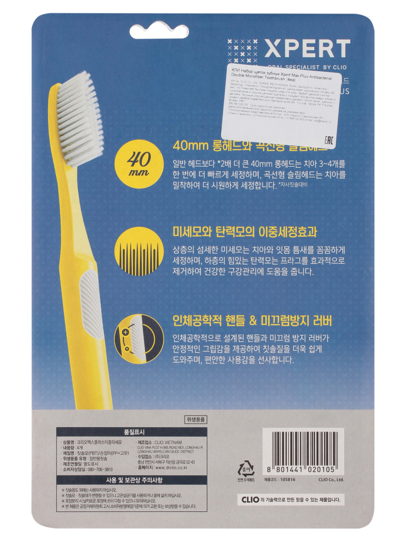 Изг-ль: CLIO Co., Ltd., КОРЕЯ, РЕСПУБЛИКА, 52-43, Geumgok-ro, Jiksan-eup, Seobuk-gu, Cheonan-si, Chungcheongnam-do. Щетка имеет удлиненную головку (40 мм), что позволяет быстрее очищать сразу 3-4 зуба. Эффект двойной очистки –ультратонкие и упругие щетинки тщательно очищают промежутки между зубами и деснами. Прочные упругие щетинки эффективно удаляют зубной налет. Щетинки с ионами серебра подавляют рост бактерий на 99,9%.
