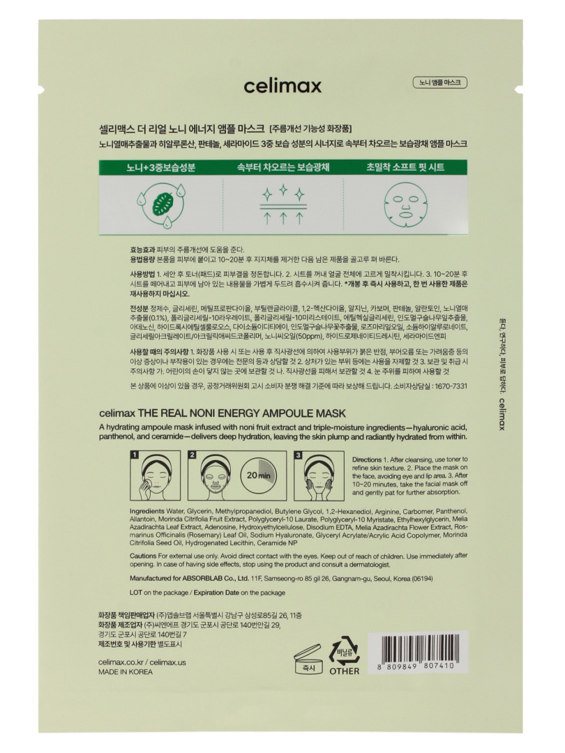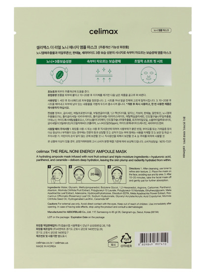 CLM Noni Маска на тканевой основе с нони CELIMAX THE REAL NONI ENERGY AMPOULE MASK, 29мл