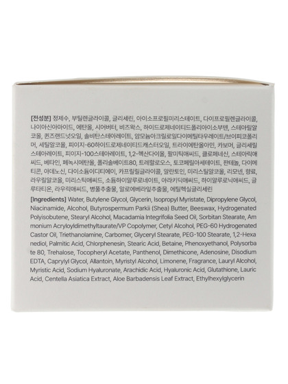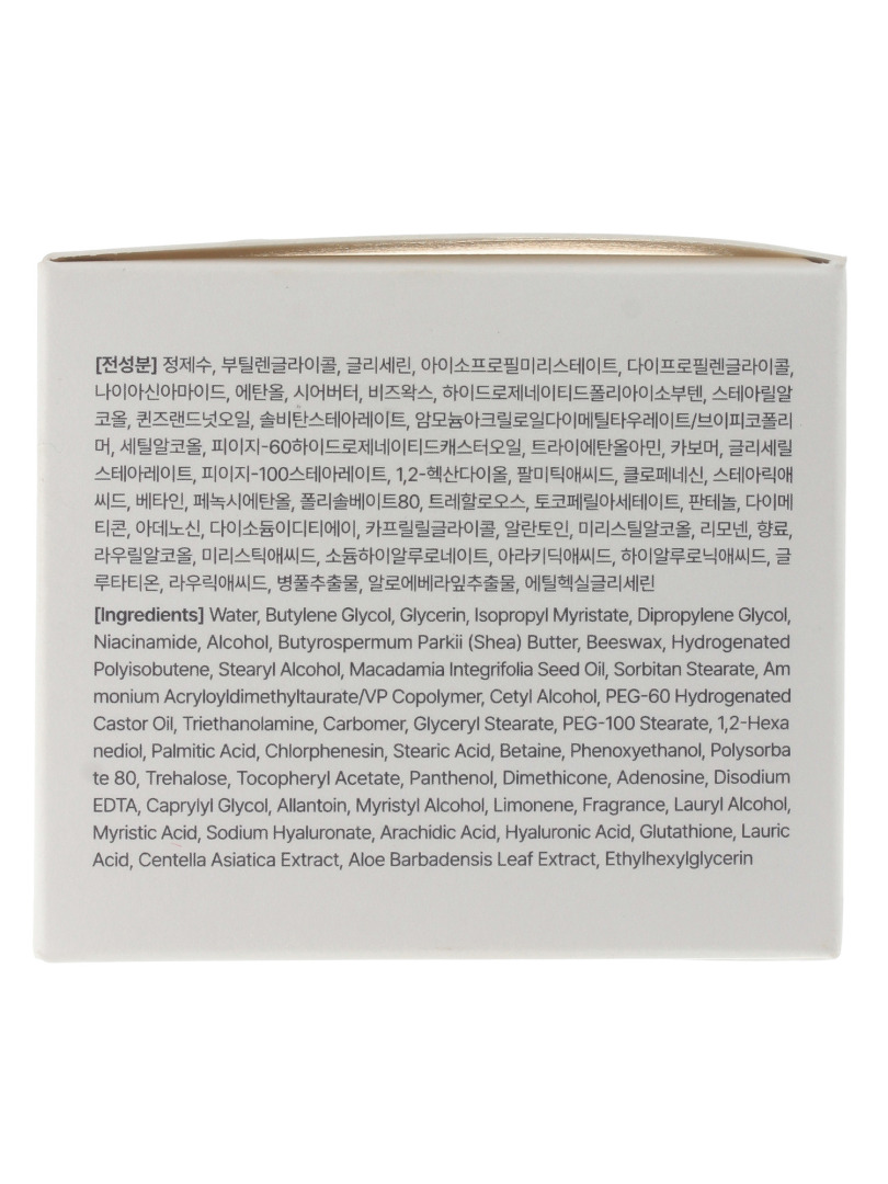 Water, Butylene Glycol, Glycerin, Isopropyl Myristate, Dipropylene Glycol, Niacinamide, Alcohol, Butyrospermum Parkii (Shea) Butter, Beeswax, Hydrogenated Polyisobutene, Stearyl Alcohol, Macadamia Integrifolia Seed Oil, Sorbitan Stearate, Ammonium Acryloyldimethyltaurate/VP Copolymer, Cetyl Alcohol, PEG-60 Hydrogenated Castor Oil, Triethanolamine, Carbomer, Glyceryl Stearate, PEG-100 Stearate, 1,2-Hexanediol, Palmitic Acid, Chlorphenesin, Stearic Acid, Betaine, Phenoxyethanol, Polysorbate 80, Trehalose, Tocopheryl Acetate, Panthenol, Dimethicone, Adenosine, Disodium EDTA, Caprylyl Glycol, Allantoin, Myristyl Alcohol, Limonene, Fragrance, Lauryl Alcohol, Myristic Acid, Sodium Hyaluronate, Arachidic Acid, Hyaluronic Acid, Glutathione, Lauric Acid, Centella Asiatica Extract, Aloe Barbadensis Leaf Extract, Ethylhexylglycerin