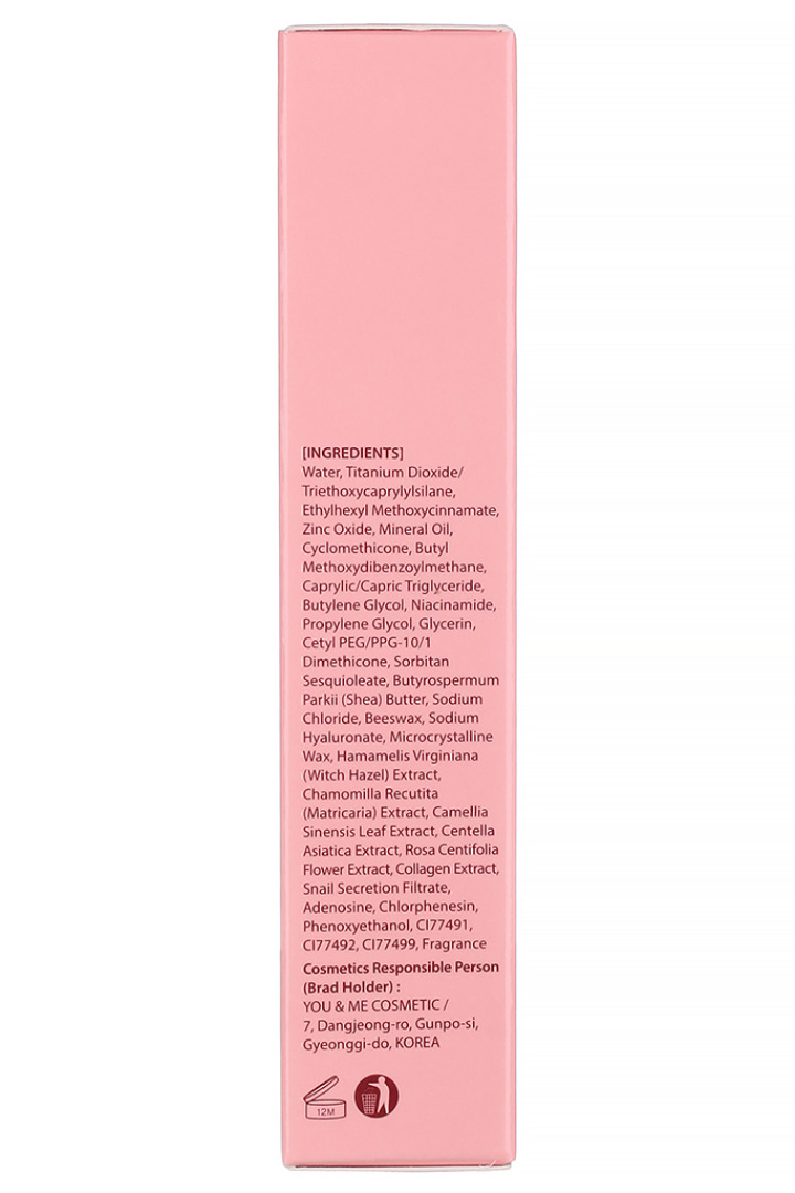 Water, Titanium Dioxide /Triethoxycaprylylsilane, Ethylhexyl Methoxycinnamate, Zinc Oxide, Mineral Oil, Cyclomethicone, Butyl Methoxydibenzoylmethane, Caprylic/Capric Triglyceride, Butylene Glycol, Niacinamide, Propylene Glycol, Glycerin, Cetyl PEG/PPG-10/1 Dimethicone, Sorbitan Sesquioleate, Butyrospermum Parkii (Shea) Butter, Sodium Chloride, Bees Wax, Sodium Hyaluronate, Microcrystalline Wax, Hamamelis Virginiana (Witch Hazel) Extract, Chamomilla Recutita (Matricaria) Extract, Camellia Sinensis Leaf Extract, Centella Asiatica Extract, Rosa Centifolia Flower Extract, Collagen Extract, Snail Secretion Filtrate, Adenosine, Chlorphenesin, Phenoxyethanol, CI 77491, CI 77492, CI 77499, Fragrance