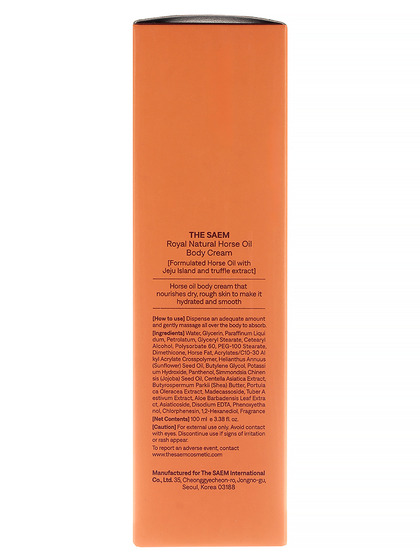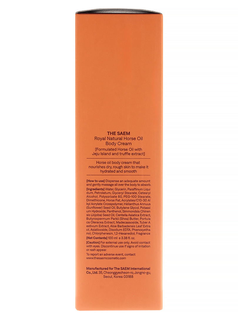 Изг-ль: THE SAEM INTERNATIONAL CO.LTD., КОРЕЯ, РЕСПУБЛИКА, 10F, 35, Cheonggyecheon-ro, Jongno-gu, Seoul. Увлажняющий питательный уход премиум класса для тела с лошадиным жиром. Благодаря экологически чистому лошадиному жиру с о.Чечджу и экстракту трутовика, средство обеспечивает не просто увлажнение, а премиальный питательный уход. Оказывает увлажняющий +успокаивающий уход. 2 типа увлажняющих компонента в текстуре крема предотвращают испарение влаги и обеспечивают непрерывное увлажнение. Масляные увлажнители: ланолин, минеральное масло, масло семян тыквы, масло семян подсолнечника, петролатум. Водорастворимый увлажнитель: глицерин. Формируется защитный барьер, который защищает кожу от внешних раздражителей. Способ применения: после душа нанесите необходимое количество средства ну сухое тело и аккуратно помассируйте.