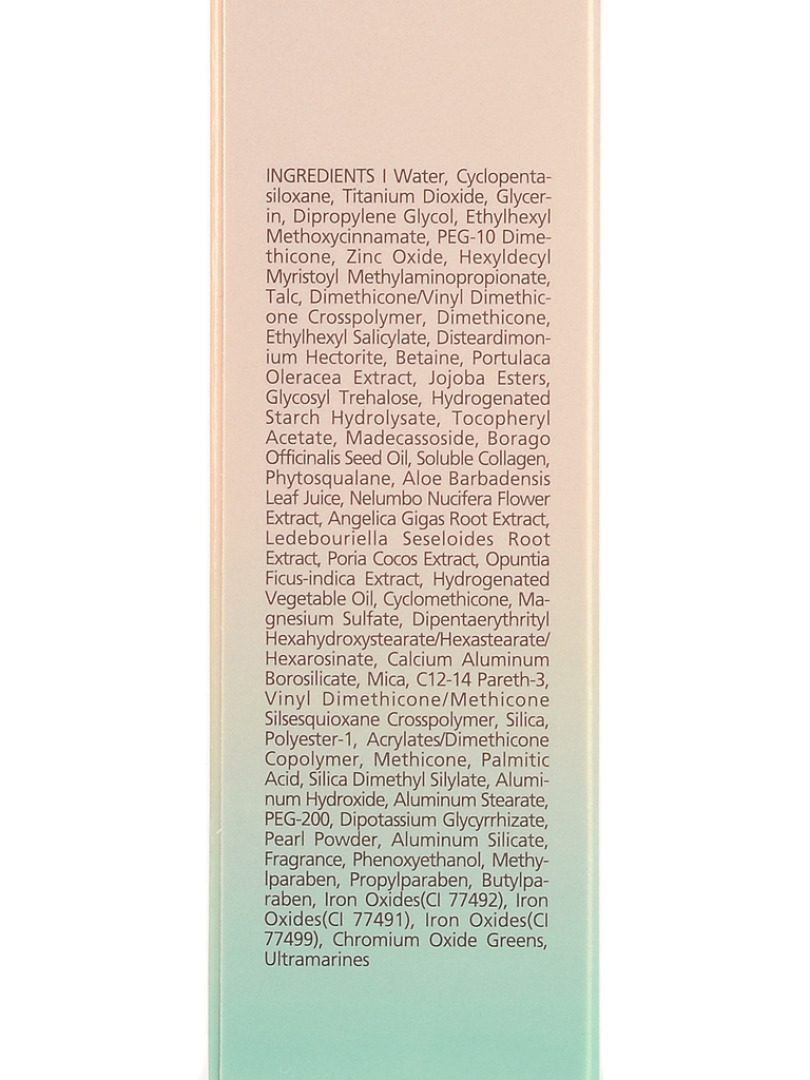 Water, cyclopentasiloxane, titanium dioxide, glycerin, dipropylene glycol, ethylhexyl methoxycinnamate, peg-10 dimethicone, zinc oxide, hexyldecyl myristoylmethylaminopropionate, dimethicone, talc, dimethicone/vinyl dimethiconecrosspolymer, ethylhexyl salicylate, disteardimonium hectorite, betaine, cyclomethicone, magnesium sulfate, iron oxides(ci 77492), dipentaerythritylhexahydroxystearate/hexastearate/hexarosinate, calcium aluminum borosilicate, jojoba esters, mica, iron oxides(ci 77491), iron oxides(ci 77499), phenoxyethanol, c12-14 pareth-3, chromium oxide greens, vinyl dimethicone/methiconesilsesquioxane crosspolymer, glycosyl trehalose, silica, methicone, acrylates/dimethicone copolymer, methylparaben, palmitic acid, fragrance, polyester-1, silica dimethyl silylate, hydrogenated starch hydrolysate, portulaca oleracea extract, tocopheryl acetate, propylparaben, aluminum hydroxide