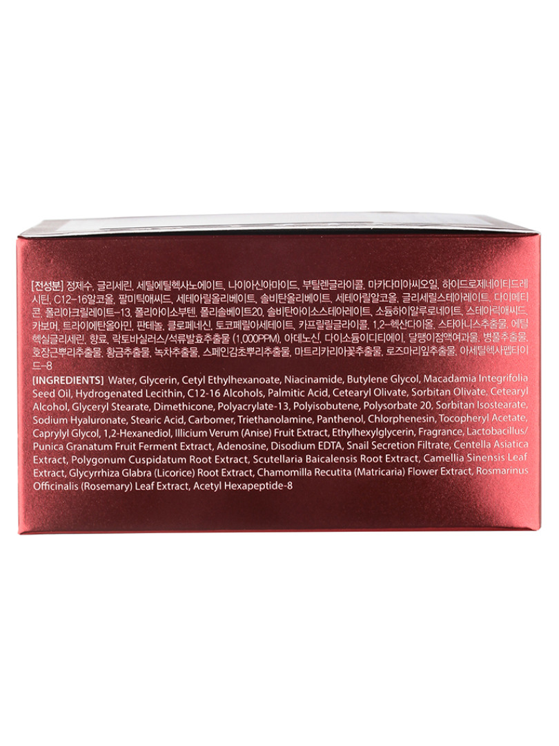 Water, Glycerin, Cetyl Ethylhexanoate, Niacinamide, Butylene Glycol, Macadamia Integrifolia Seed Oil, Hydrogenated Lecithin, C12-16 Alcohols, Palmitic Acid, Cetearyl Olivate, Sorbitan Olivate, Cetearyl Alcohol, Glyceryl Stearate, Dimethicone, Polyacrylate-13, Polyisobutene, Polysorbate 20, Sorbitan Isostearate, Sodium Hyaluronate, Stearic Acid, Carbomer, Triethanolamine, Panthenol, Chlorphenesin, Tocopheryl Acetate, Caprylyl Glycol, 1,2-Hexanediol, Illicium Verum (Anise) Fruit Extract, Ethylhexylglycerin, Fragrance, Lactobacillus/Punica Granatum Fruit Ferment Extract, Adenosine, Disodium EDTA, Snail Secretion Filtrate, Centella Asiatica Extract, Polygonum Cuspidatum Root Extract, Scutellaria Baicalensis Root Extract, Camellia Sinensis Leaf Extract, Glycyrrhiza Glabra (Licorice) Root Extract, Chamomilla Recutita (Matricaria) Flower Extract, Rosmarinus Officinalis (Rosemary) Leaf Extract, Acetyl Hexapeptide-8