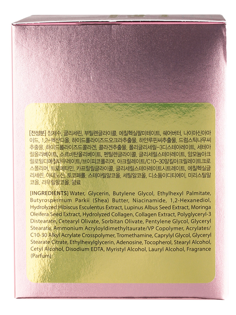 Water, glycerin, butylene glycol, ethylhexyl palmitate, shea butter, niacinamide, 1,2-hexanediol, polyglyceryl-2 distearate, cetearyl olivate, sorbitan olivate, pentylene glycol, adenosine, hydrolyzed hibiscus esculentus extruct, lupinus albus seed extract, moringa oleifera seed extract, hydrolyzed collagen, collagen extract