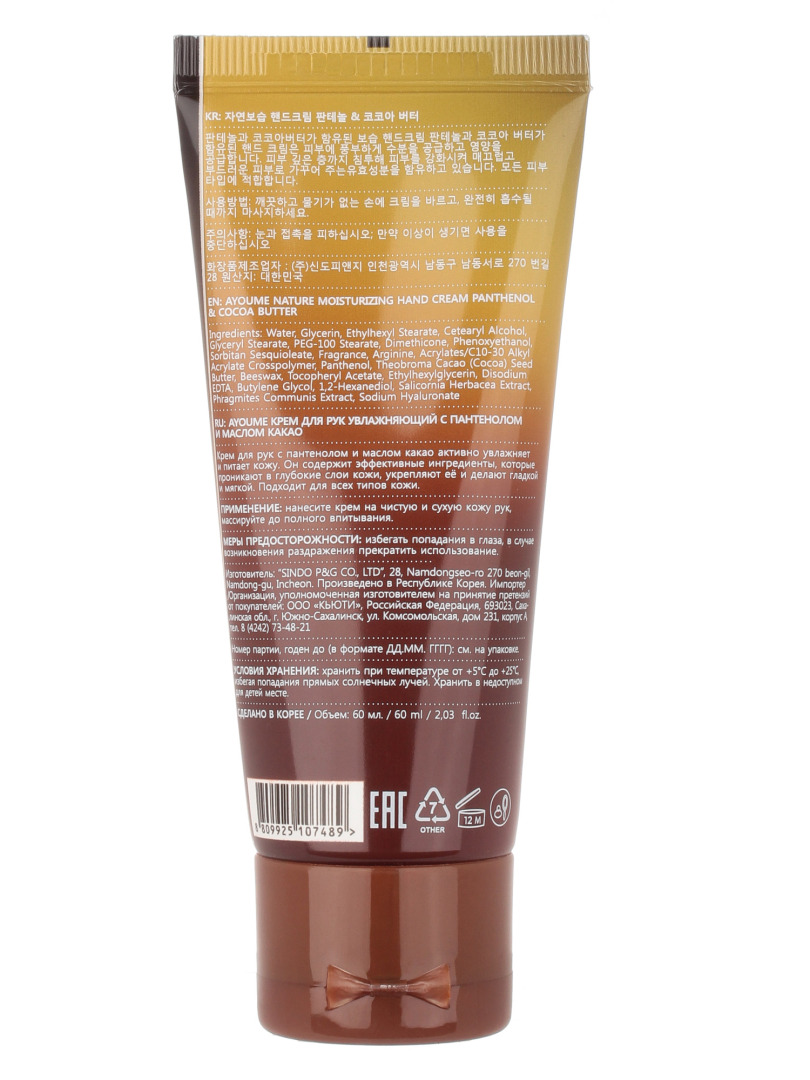 Изг-ль: SINDO P&G Co., LTD., Корея, Республика, 28, Namdongseo-ro 270 beon-gil, Namdong-gu, Incheon. Крем для рук с пантенолом и маслом какао активно увлажняет и питает кожу. Он содержит эффективные ингредиенты, которые проникают в глубокие слои кожи, укрепляют её и делают гладкой и мягкой. Подходит для всех типов кожи. Применение: нанесите крем на чистую и сухую кожу рук, массируйте до полного впитывания. Меры предосторожности: избегать попадания в глаза, в случае возникновения раздражения прекратить использование.