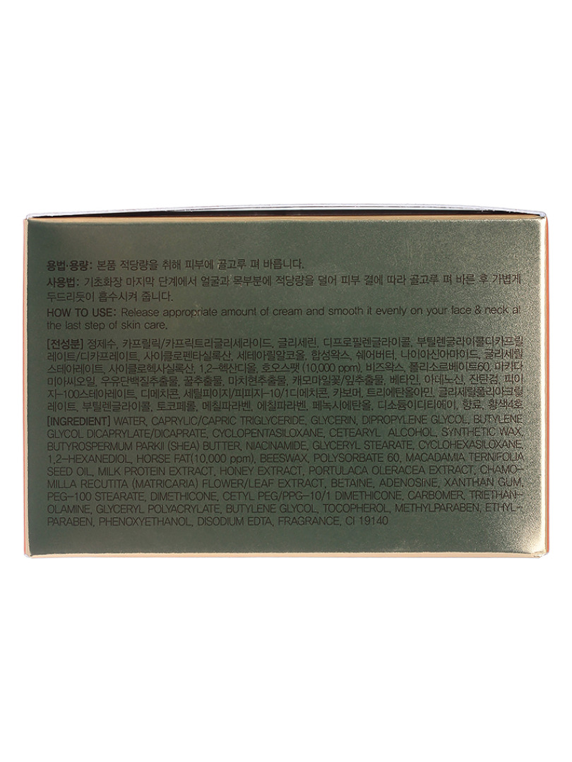 Water, caprylic/capric triglyceride , glycerin , dipropylene glycol, butylene glycol dicaprylate/dicaprate , cyclopentasiloxane, cetearyl alcohol , synthetic wax, butyrospermum parkii (shea) butter , niacinamide, glyceryl polyacrylate , glyceryl stearate , cyclohexasiloxane, 1,2-hexanediol, horse fat , beeswax , polysorbate 60 ,macadamia ternifolia seed oil , milk protein extract , honey extract, portulaca oleracea extract, chamomilla recutita (matricaria) flower extract, betaine , adenosine, xanthan gum, peg-100 stearate , dimethicone , cetyl peg/ppg-10/1 dimethicone , carbomer, triethanolamine, phenoxyethanol, disodium edta , fragrance, ci 19140