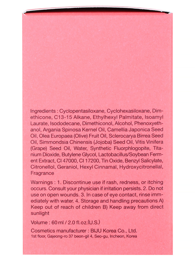 Cyclopentasiloxane, Dimethicone, Cyclohexasiloxane, C13-15 Alkane, Dimethiconol, Ethylhexyl Palmitate, Isododecane, Isoamyl Laurate, Alcohol, Phenoxyethanol, Vitis Vinifera (Grape) Seed Oil, Argania Spinosa Kernel Oil, Camellia Japonica Seed Oil, Olea Europaea (Olive) Fruit Oil, "Simmondsia Chinensis (Jojoba) Seed, Oil", Sclerocarya Birrea Seed Oil, CI 47000, CI 17200, Synthetic Fluorphlogopite, Tin Oxide, Titanium Dioxide, Lactobacillus/Soybean Ferment Extract, Butylene Glycol, Water, Fragrance(Benzyl Salicylate, Citronellol, Geraniol, Hexyl Cinnamal, Hydroxycitronellal), t, Ethylhexylglycerin, Phenoxyethanol, CI 42090, CI 17200, Butylene Glycol, Cynanchum Atratum Extract