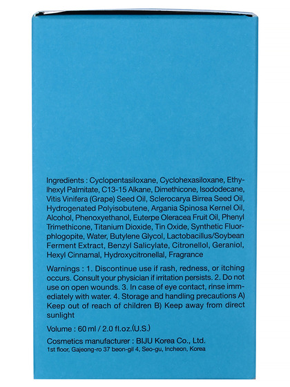 Cyclopentasiloxane, Cyclohexasiloxane, Ethylhexyl Palmitate, C13-15 Alkane, Dimethicone, Isododecane, Hydrogenated Polyisobutene, Alcohol, Sclerocarya Birrea Seed Oil, Vitis Vinifera (Grape) Seed Oil, Argania Spinosa Kernel Oil, Euterpe Oleracea Fruit Oil, Phenoxyethanol, Phenyl Trimethicone, Synthetic Fluorphlogopite, Tin Oxide, Titanium Dioxide, Lactobacillus/Soybean Ferment Extract, Butylene Glycol, Water, Fragrance(Benzyl Salicylate, Citronellol, Geraniol, Hexyl Cinnamal, Hydroxycitronellal)