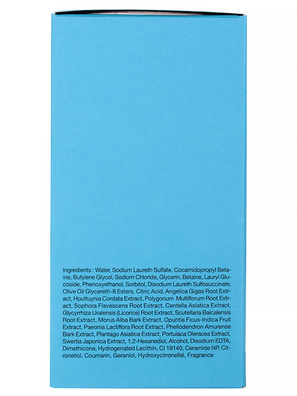 Water, Sodium Laureth Sulfate, Cocamidopropyl Betaine, Sodium Chloride, Butylene Glycol, Glycerin, Lauryl Glucoside, Alcohol, Disodium Laureth Sulfosuccinate, Sorbitol, Betaine, Sophora Flavescens Root Extract, Angelica Gigas Root Extract, Polygonum Multiflorum Root Extract, Houttuynia Cordata Extract, "Glycyrrhiza Uralensis (Licorice) Root, Extract", Scutellaria Baicalensis Root Extract, Centella Asiatica Extract, Morus Alba Bark Extract, Swertia Japonica Extract, Plantago Asiatica Extract, Opuntia Ficus-Indica Fruit Extract, Phellodendron Amurense Bark Extract, Paeonia Lactiflora Root Extract, Portulaca Oleracea Extract, 1,2-Hexanediol, Phenoxyethanol, Dimethicone, Hydrogenated Lecithin, Ceramide NP, Olive Oil Glycereth-8 Esters, Citric Acid, Disodium EDTA, CI 19140, "Fragrance (Citronellol, Coumarin,, Geraniol, Hydroxycitronellal)
