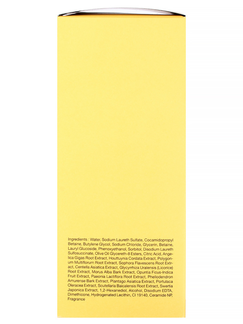 Water, Sodium Laureth Sulfate, Cocamidopropyl Betaine, Sodium Chloride, Butylene Glycol, Glycerin, Lauryl Glucoside, Alcohol, Disodium Laureth Sulfosuccinate, Sorbitol, Betaine, Sophora Flavescens Root Extract, Angelica Gigas Root Extract, Polygonum Multiflorum Root Extract, Houttuynia Cordata Extract, "Glycyrrhiza Uralensis (Licorice) Root, Extract", Scutellaria Baicalensis Root Extract, Centella Asiatica Extract, Morus Alba Bark Extract, Swertia Japonica Extract, Plantago Asiatica Extract, Opuntia Ficus-Indica Fruit Extract, Phellodendron Amurense Bark Extract, Paeonia Lactiflora Root Extract, Portulaca Oleracea Extract, 1,2-Hexanediol, Phenoxyethanol, Dimethicone, Hydrogenated Lecithin, Ceramide NP, Olive Oil Glycereth-8 Esters, Citric Acid, Disodium EDTA, CI 19140, Fragrance