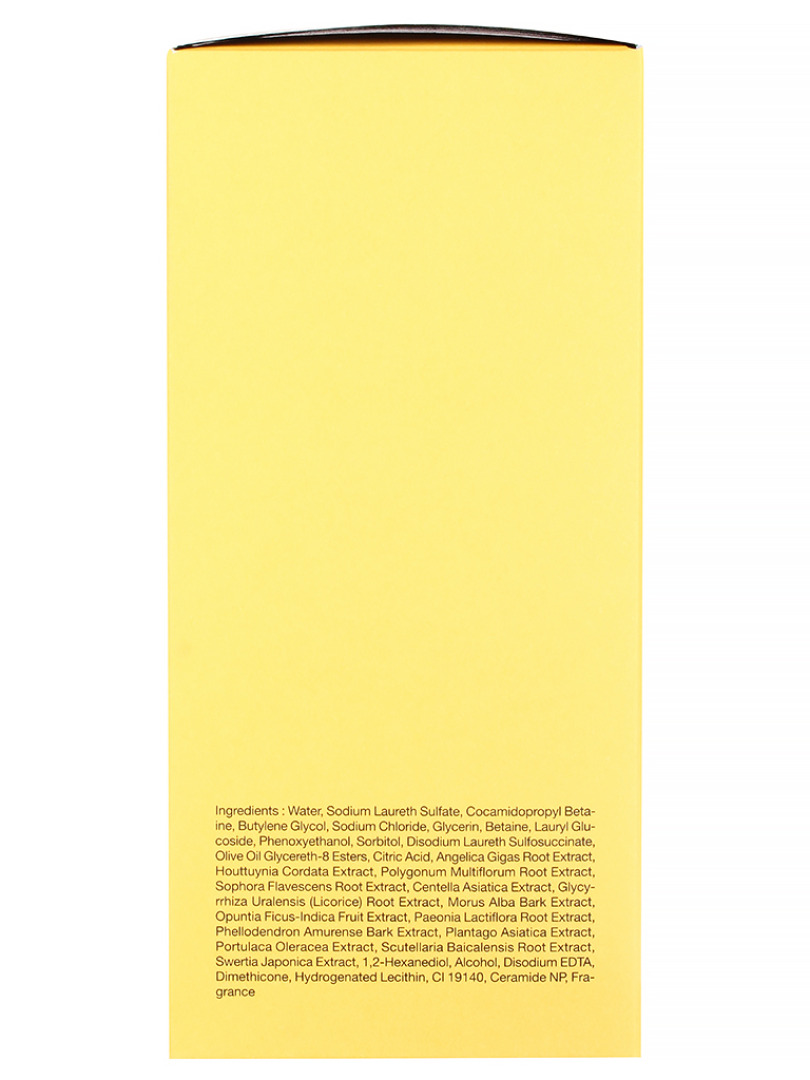 Water, Sodium Laureth Sulfate, Cocamidopropyl Betaine, Sodium Chloride, Butylene Glycol, Glycerin, Lauryl Glucoside, Alcohol, Disodium Laureth Sulfosuccinate, Sorbitol, Betaine, Sophora Flavescens Root Extract, Angelica Gigas Root Extract, Polygonum Multiflorum Root Extract, Houttuynia Cordata Extract, "Glycyrrhiza Uralensis (Licorice) Root, Extract", Scutellaria Baicalensis Root Extract, Centella Asiatica Extract, Morus Alba Bark Extract, Swertia Japonica Extract, Plantago Asiatica Extract, Opuntia Ficus-Indica Fruit Extract, Phellodendron Amurense Bark Extract, Paeonia Lactiflora Root Extract, Portulaca Oleracea Extract, 1,2-Hexanediol, Phenoxyethanol, Dimethicone, Hydrogenated Lecithin, Ceramide NP, Olive Oil Glycereth-8 Esters, Citric Acid, Disodium EDTA, CI 19140, Fragrance