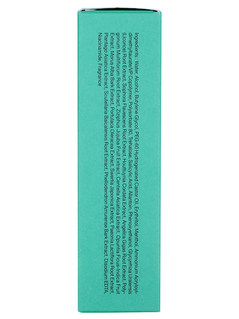 Water, Alcohol, Butylene Glycol, PEG-60 Hydrogenated Castor Oil, Erythritol, Sophora Flavescens Root Extract, Angelica Gigas Root Extract, Polygonum Multiflorum Root Extract, Houttuynia Cordata Extract, "Glycyrrhiza Uralensis (Licorice) Root, Extract", Scutellaria Baicalensis Root Extract, Ziziphus Jujuba Fruit Extract, Centella Asiatica Extract, Morus Alba Bark Extract, Swertia Japonica Extract, Plantago Asiatica Extract, Opuntia Ficus-Indica Fruit Extract, Phellodendron Amurense Bark Extract, Paeonia Lactiflora Root Extract, Portulaca Oleracea Extract, Menthol, "Ammonium, Acryloyldimethyltaurate/VP", Polysorbate 80, Trehalose, Salicylic Acid, Allantoin, Phenoxyethanol, Disodium EDTA, Niacinamide, Fragrance