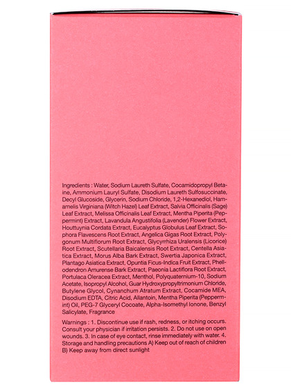 Water, Sodium Laureth Sulfate, Cocamidopropyl Betaine, Sodium Chloride, Ammonium Lauryl Sulfate, Disodium Laureth Sulfosuccinate, Decyl Glucoside, Glycerin, 1,2-Hexanediol, "Hamamelis Virginiana (Witch Hazel), Leaf Extract", Salvia Officinalis (Sage) Leaf Extract, Melissa Officinalis Leaf Extract, Mentha Piperita (Peppermint) Extract, "Lavandula Angustifolia (Lavender), Flower Extract", Houttuynia Cordata Extract, Eucalyptus Globulus Leaf Extract, Sophora Flavescens Root Extract, Angelica Gigas Root Extract, Polygonum Multiflorum Root Extract, "Glycyrrhiza Uralensis (Licorice) Root, Extract", Scutellaria Baicalensis Root Extract, Centella Asiatica Extract, Morus Alba Bark Extract, Swertia Japonica Extract, Plantago Asiatica Extract, Opuntia Ficus-Indica Fruit Extract, Phellodendron Amurense Bark Extract, Paeonia Lactiflora Root Extract, Portulaca Oleracea Extract, "Fragrance (Alpha-Isomethyl Ionone,, Benzyl Salicylate)", Menthol, Polyquaternium-10, Sodium Acetate, Isopropyl Alcohol, "Guar Hydroxypropyltrimonium, Chloride", Butylene Glycol, Cynanchum Atratum Extract, Cocamide MEA, Disodium EDTA, Citric Acid, Allantoin, Mentha Piperita (Peppermint) Oil, PEG-7 Glyceryl Cocoate