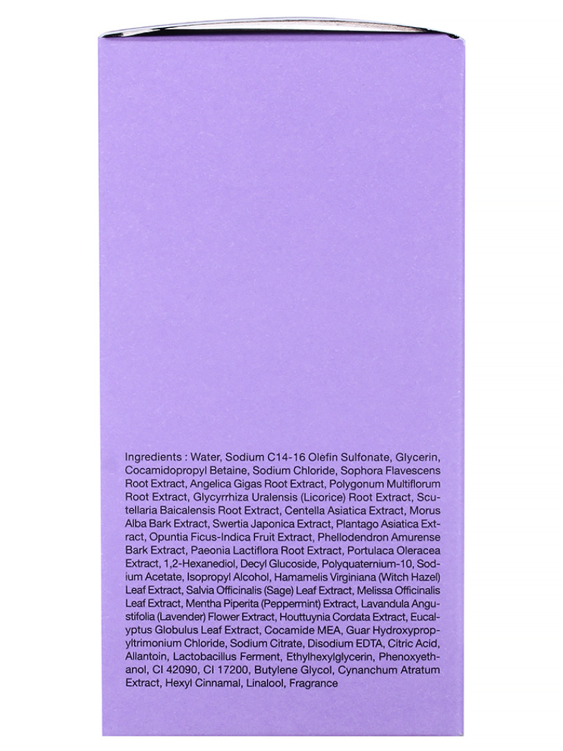 Water, Sodium C14-16 Olefin Sulfonate, Cocamidopropyl Betaine, Sodium Chloride, Glycerin, Sophora Flavescens Root Extract, Angelica Gigas Root Extract, Polygonum Multiflorum Root Extract, Houttuynia Cordata Extract, "Glycyrrhiza Uralensis (Licorice) Root, Extract", Scutellaria Baicalensis Root Extract, Centella Asiatica Extract, Morus Alba Bark Extract, Swertia Japonica Extract, Plantago Asiatica Extract, Opuntia Ficus-Indica Fruit Extract, Phellodendron Amurense Bark Extract, Paeonia Lactiflora Root Extract, Portulaca Oleracea Extract, 1,2-Hexanediol, Decyl Glucoside, Fragrance (Hexyl Cinnamal, Linalool), Polyquaternium-10, Sodium Acetate, Isopropyl Alcohol, "Hamamelis Virginiana (Witch Hazel), Leaf Extract", Salvia Officinalis (Sage) Leaf Extract, Melissa Officinalis Leaf Extract, Mentha Piperita (Peppermint) Extract, "Lavandula Angustifolia (Lavender), Flower Extract", Eucalyptus Globulus Leaf Extract, Cocamide MEA, Guar Hydroxypropyltrimonium, Chloride", Sodium Citrate, Disodium EDTA, Citric Acid, Allantoin, Lactobacillus Fermen