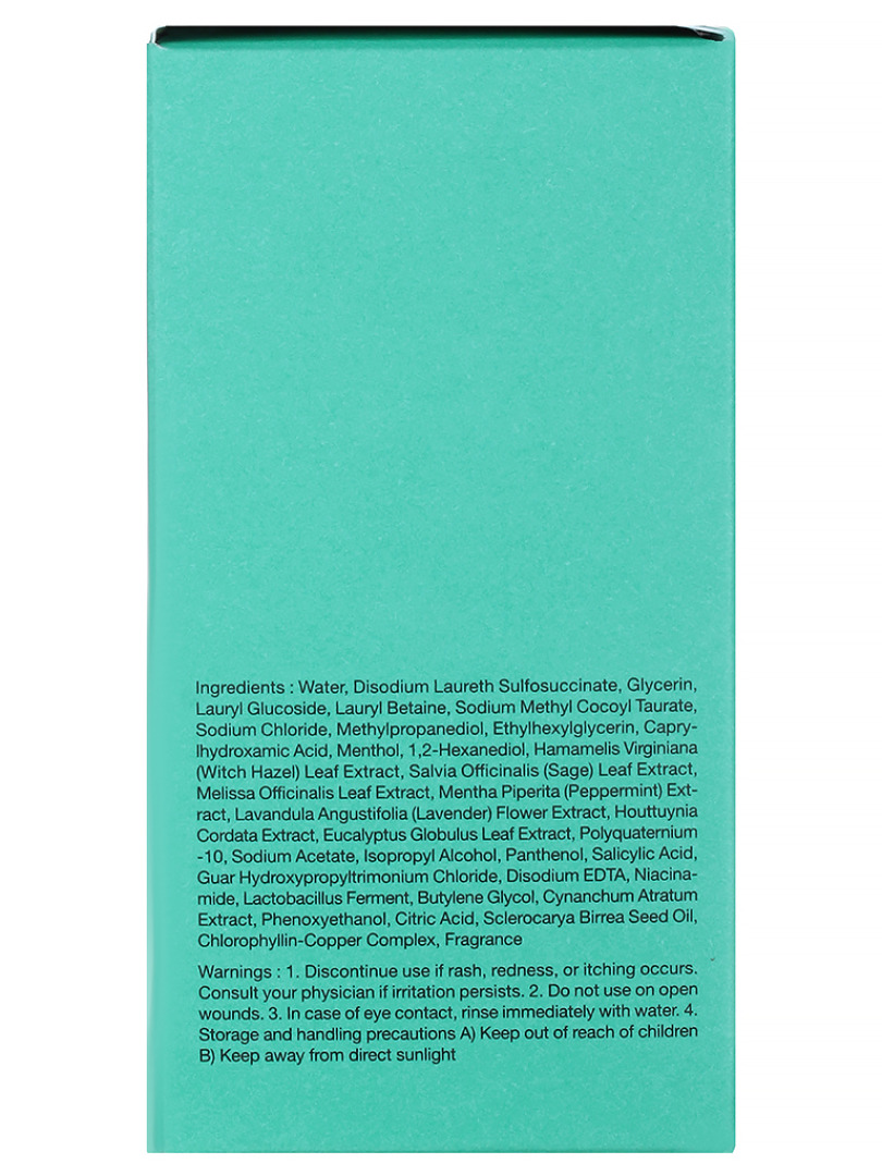 Water, Disodium Laureth Sulfosuccinate, Lauryl Betaine, Sodium Chloride, Lauryl Glucoside, Glycerin, Sodium Methyl Cocoyl Taurate, Methylpropanediol, Ethylhexylglycerin, Caprylhydroxamic Acid, Fragrance, Menthol, 1,2-Hexanediol, Hamamelis Virginiana (Witch Hazel), Leaf Extract", Salvia Officinalis (Sage) Leaf Extract, Melissa Officinalis Leaf Extract, Mentha Piperita (Peppermint) Extract, "Lavandula Angustifolia (Lavender), Flower Extract", Houttuynia Cordata Extract, Eucalyptus Globulus Leaf Extract, Polyquaternium-10, Sodium Acetate, Isopropyl Alcohol, Panthenol, Salicylic Acid, "Guar Hydroxypropyltrimonium, Chloride", Disodium EDTA, Niacinamide, Lactobacillus Ferment, Butylene Glycol, Cynanchum Atratum Extract, Phenoxyethanol, Citric Acid, Sclerocarya Birrea Seed Oil, Chlorophyllin-Copper Complex