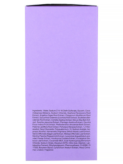 Water, Sodium C14-16 Olefin Sulfonate, Cocamidopropyl Betaine, Sodium Chloride, Glycerin, Sophora Flavescens Root Extract, Angelica Gigas Root Extract, Polygonum Multiflorum Root Extract, Houttuynia Cordata Extract, "Glycyrrhiza Uralensis (Licorice) Root, Extract", Scutellaria Baicalensis Root Extract, Centella Asiatica Extract, Morus Alba Bark Extract, Swertia Japonica Extract, Plantago Asiatica Extract, Opuntia Ficus-Indica Fruit Extract, Phellodendron Amurense Bark Extract, Paeonia Lactiflora Root Extract, Portulaca Oleracea Extract, 1,2-Hexanediol, Decyl Glucoside, Fragrance (Hexyl Cinnamal, Linalool), Polyquaternium-10, Sodium Acetate, Isopropyl Alcohol, "Hamamelis Virginiana (Witch Hazel), Leaf Extract", Salvia Officinalis (Sage) Leaf Extract, Melissa Officinalis Leaf Extract, Mentha Piperita (Peppermint) Extract, "Lavandula Angustifolia (Lavender), Flower Extract", Eucalyptus Globulus Leaf Extract, Cocamide MEA, Guar Hydroxypropyltrimonium, Chloride", Sodium Citrate, Disodium EDTA, Citric Acid, Allantoin, Lactobacillus Fermen
