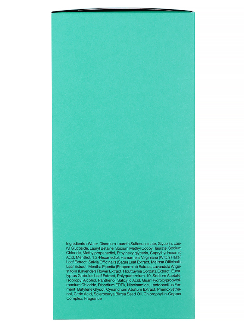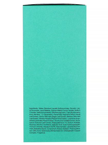 Water, Disodium Laureth Sulfosuccinate, Lauryl Betaine, Sodium Chloride, Lauryl Glucoside, Glycerin, Sodium Methyl Cocoyl Taurate, Methylpropanediol, Ethylhexylglycerin, Caprylhydroxamic Acid, Fragrance, Menthol, 1,2-Hexanediol, Hamamelis Virginiana (Witch Hazel), Leaf Extract", Salvia Officinalis (Sage) Leaf Extract, Melissa Officinalis Leaf Extract, Mentha Piperita (Peppermint) Extract, "Lavandula Angustifolia (Lavender), Flower Extract", Houttuynia Cordata Extract, Eucalyptus Globulus Leaf Extract, Polyquaternium-10, Sodium Acetate, Isopropyl Alcohol, Panthenol, Salicylic Acid, "Guar Hydroxypropyltrimonium, Chloride", Disodium EDTA, Niacinamide, Lactobacillus Ferment, Butylene Glycol, Cynanchum Atratum Extract, Phenoxyethanol, Citric Acid, Sclerocarya Birrea Seed Oil, Chlorophyllin-Copper Complex