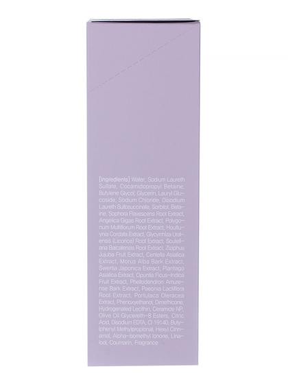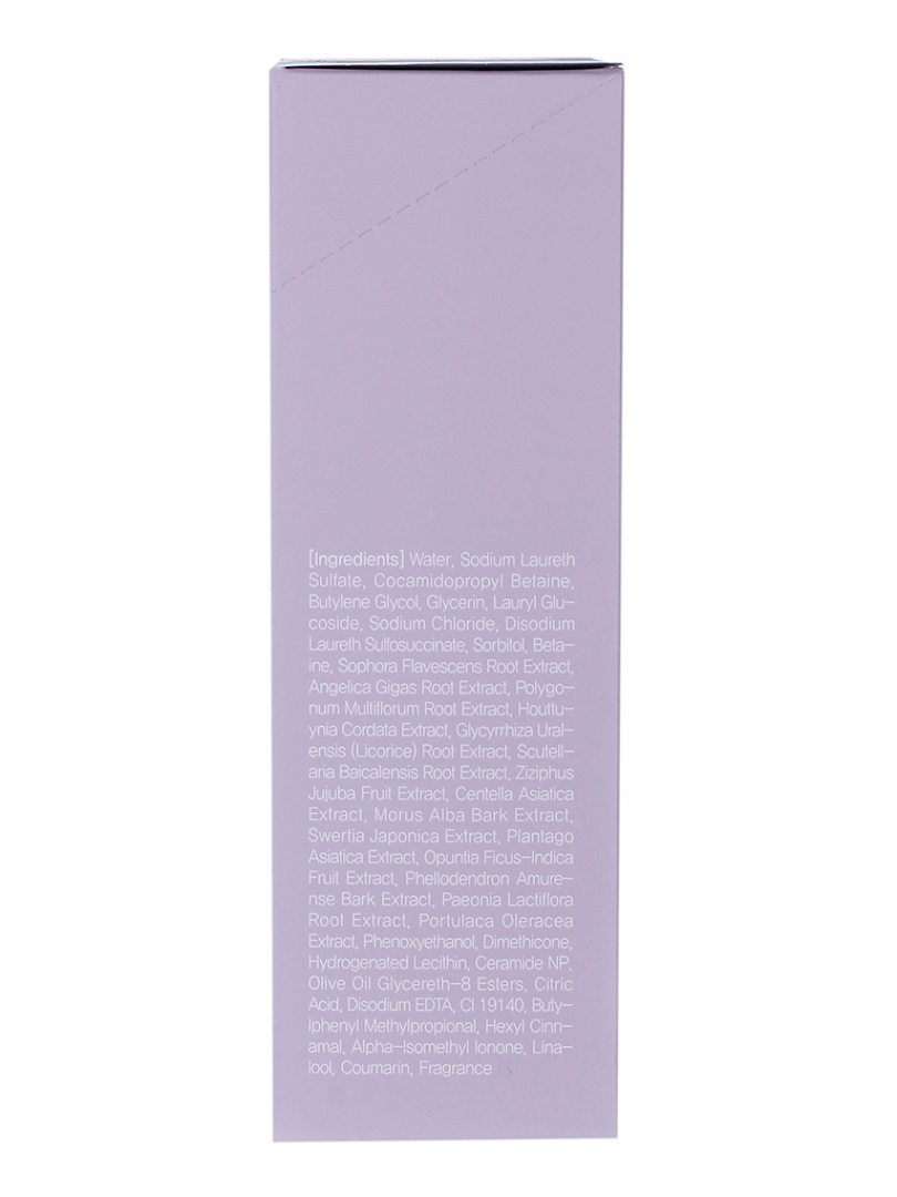 Water, Sodium Laureth Sulfate, Cocamidopropyl Betaine, Butylene Glycol, Glycerin, Lauryl Glucoside, Sodium Chloride, Disodium Laureth Sulfosuccinate, Sorbitol, Betaine, Sophora Flavescens Root Extract, Scutellaria Baicalensis Root Extract, Polygonum Multiflorum Root Extract, Houttuynia Cordata Extract, Glycyrrhiza Uralensis (Licorice) Root Extract, Centella Asiatica Extract, Angelica Gigas Root Extract, Swertia Japonica Extract, Portulaca Oleracea Extract, Plantago Asiatica Extract, Phellodendron Amurense Bark Extract, Paeonia Lactiflora Root Extract, Opuntia Ficus-Indica Fruit Extract, Morus Alba Bark Extract, Phenoxyethanol, Dimethicone, Hydrogenated Lecithin, Ceramide NP, Olive Oil Glycereth-8 Esters, Citric Acid, Disodium EDTA, CI 19140, Fragrance (Amyl Cinnamal, Benzyl Salicylate, Geraniol, Hexyl Cinnamal, Linalool)t
