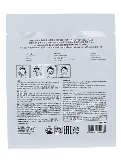 Изготовитель: GREENCOS Co.Ltd., Республика Корея, 64-30, Hagunsandan 1-ro, Yangchon-eup, Gimpo-si, Gyeonggi-do. Тканевая крем-маска с экстрактом зеленого чая интенсивно увлажняет кожу и создает невидимую защитную пленку, которая удерживает влагу и спасает кожу от обезвоживания. Зеленый чай способствует разглаживанию морщин, улучшает цвет лица и придает коже эластичность и тонус. Средство борется с признаками старения кожи, является прекрасным антиоксидантом и оказывает противовоспалительное и антибактериальное действие. Способ применения: Наложить маску на очищенную кожу лица, оставить на 10-20 минут, затем снять, не смывать.