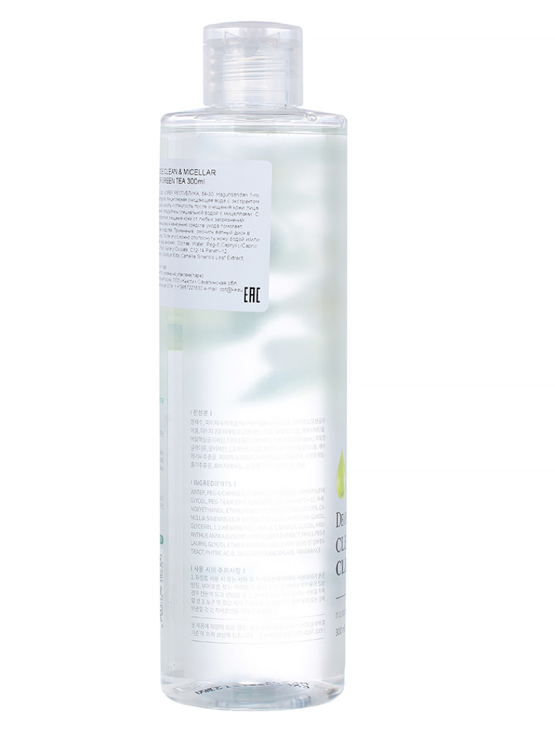 Изг-ль: GREENCOS Co.Ltd., КОРЕЯ, РЕСПУБЛИКА, 64-30, Hagunsandan 1-ro, Yangchon-eup, Gimpo-si, Gyeonggi-do. Мицеллярная очищающая вода c экстрактом зеленого чая. Чтобы не ощущать сухость и стянутость после очищения кожи лица от макияжа и других загрязнений, пользуйтесь специальной водой с мицеллами. С этим средством возможно комфортное очищение кожи от любых загрязнений. Успокоить и бережно подготовить кожу к нанесению средств ухода помогает экстракт зеленого чая в составе средства. Применение: смочить ватный диск в очищающей воде. Очистить кожу. После этого можно сполоснуть кожу водой и/или продолжить свой ежедневный уход за кожей.