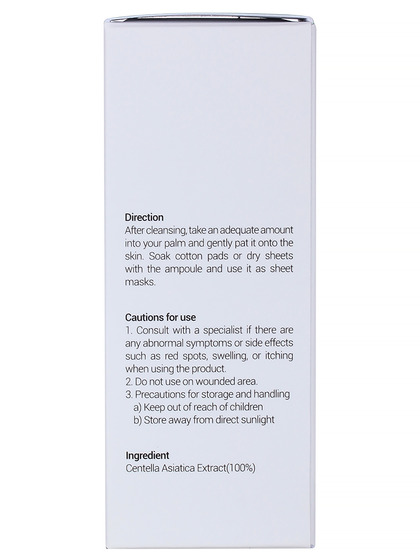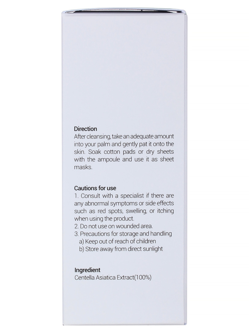 Изг-ль: T.O.M. Co., Ltd., Daeyoung Plaza-701, 103, Doraeul-ro, Deogyang-gu, Goyang-si, Gyeonggi-do, Республика Корея. Сыворотка на 100% состоящая из натурального экстракта центеллы азиатской, эффективно успокаивает кожу, а также увлажняет её, помогая уменьшить видимость морщин, сухость и шелушения. Средство быстро впитывается, делая кожу более гладкой и сияющей. Оно также укрепляет защитный барьер и стимулирует восстановление кожи, подверженной стрессу и воздействию негативных внешних факторов. Способ применения: после очищения и тонизирования кожи, нанесите 2-4 капли средства на лицо, равномерно распределите по коже.