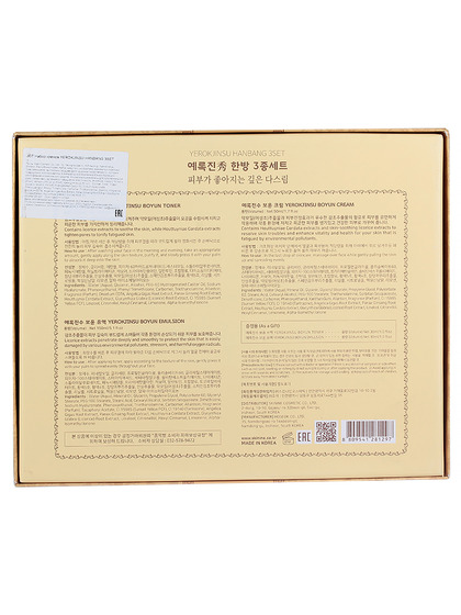 Toner: Water, Glycerin, Alcohol, PEG-60 Hydrogenated Castor Oil, Sodium Hyaluronate, Phenoxyethanol, Phenyl Trimethicone, Carbomer, Triethanolamine, Allantoin, Fragrance, Disodium EDTA, Angelica Gigas Root Extract, Panax Ginseng Root Extract, Houttuynia Cordata Extract, Glycyrrhiza Glabra (Licorice) Root, CI 15985. Emulsion: Water, Mineral Oil, Glycerin, Propylene Glycol, Polysorbate 60, Glyceryl Stearate, PEG-100 Stearate/, Stearic Acid, Cetearyl Alcohol, Sorbitan Sesquioleate, Dimethicone, Sodium Hyaluronate, Phenoxyethanol, Triethanolamine, Carbomer, Allantoin, Fragrance, Tocopheryl Acetate, CI 15985, CI 19140, Angelica Gigas Root Extract, Panax Ginseng Root Extract, Houttuynia Cordata Extract, Glycyrrhiza Glabra (Licorice) Root Extract. Cream: Water, Mineral Oil, Glycerin, Glyceryl Stearate, Propylene Glycol, Polysorbate 60, Stearic Acid, Cetearyl Alcohol, PEG-100 Stearate, Triethanolamine, Sorbitan Sesquioleate, Dimethicone, Carbomer, Phenoxyethanol, Xanthan Gum, Allantoin, Fragrance, CI 15985, CI 19140, Angelica Gigas Root Extract, Panax Ginseng Root Extract, Houttuynia Cordata Extract, Glycyrrhiza Glabra (Licorice) Root Extract