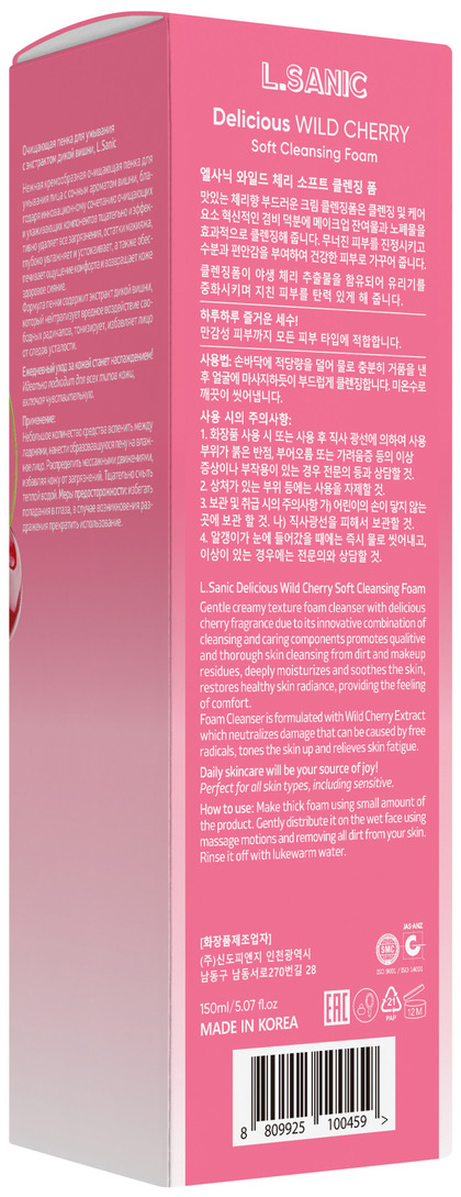 «SINDO P&G Co., Ltd », 28, Namdongseo-ro 270beon-gil, Namdong-gu, Incheon, Республика Корея. Нежная кремообразная очищающая пенка для умывания лица с сочным ароматом вишни, благодаря инновационному сочетанию очищающих и ухаживающих компонентов тщательно и эффективно удаляет все загрязнения, остатки макияжа, глубоко увлажняет и успокаивает, а также обеспечивает ощущение комфорта и возвращает коже здоровое сияние.