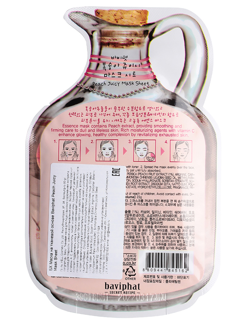 Изготовитель: «K&L K.E.L.L Со, LTD. », Южная Корея. 9F, Seolleung-ro 90gil 38, Gangnam-gu, Seoul. Тканевая маска для лица с высоким содержанием экстракта персика для гладкости, сияния и восстановления кожи. Экстракт персика содержит витамины А, С, аминокислоты, питает и смягчает кожу, тонизирует и увлажняет, помогает поддерживать кожу в тонусе и разглаживает морщинки. Помимо экстракта персика в составе присутствуют бетаин, масло ши, масло жожоба, аллантоин, экстракт гамамелиса,которые дополнительно ухаживают за кожей и усиливают защитный барьер. Способ применения: используйте только на очищенную кожу. Вскройте упаковку и расправьте лист по всей поверхности кожи лица. Оставьте маску на 15-20 минут. После, удалите маску и распределите остатки вещества массажными движениями.