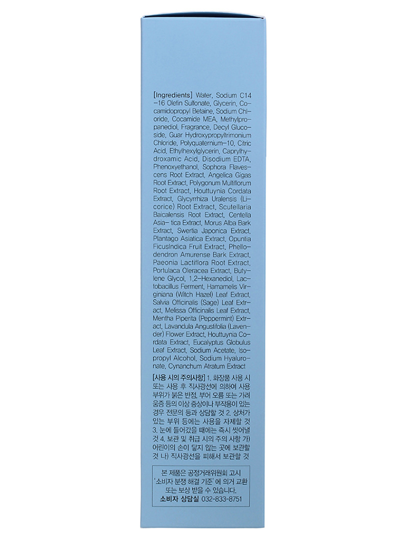Water, Sodium C14-16 Olefin Sulfonate, Glycerin, Cocamidopropyl Betaine, Sodium Chloride, Cocamide MEA, Methylpropanediol, Fragrance, Decyl Glucoside, Guar Hydroxypropyltrimonium Chloride, Polyquaternium-10, Citric Acid, Ethylhexylglycerin, Phenoxyethanol, Disodium EDTA, Caprylhydroxamic Acid, Sophora Flavescens Root Extract, Scutellaria Baicalensis Root Extract, Polygonum Multiflorum Root Extract, Houttuynia Cordata Extract, Glycyrrhiza Uralensis (Licorice) Root Extract, Centella Asiatica Extract, Angelica Gigas Root Extract, Swertia Japonica Extract, Portulaca Oleracea Extract, Plantago Asiatica Extract