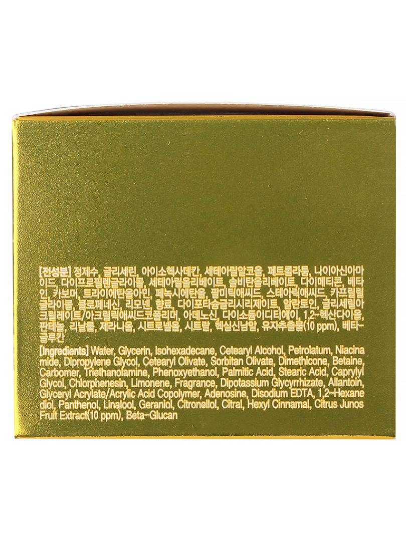 Water, Glycerin, Isohexadecane, Cetearyl Alcohol, Petrolatum, Niacinamide, Dipropylene Glycol, Cetearyl Olivate, Sorbitan Olivate, Dimethicone, Betaine, Carbomer, Triethanolamine, Phenoxyethanol, Palmitic Acid, Stearic Acid, Caprylyl Glycol, Chlorphenesin, Limonene, Fragrance, Dipotassium Glycyrrhizate, Allantoin, Glyceryl Acrylate/Acrylic Acid Copolymer, Adenosine, Disodium EDTA, 1,2-Hexanediol, Panthenol, Linalool, Geraniol, Citronellol, Citral, Hexyl Cinnamal, Citrus Junos Fruit Extract, Beta-Glucan.