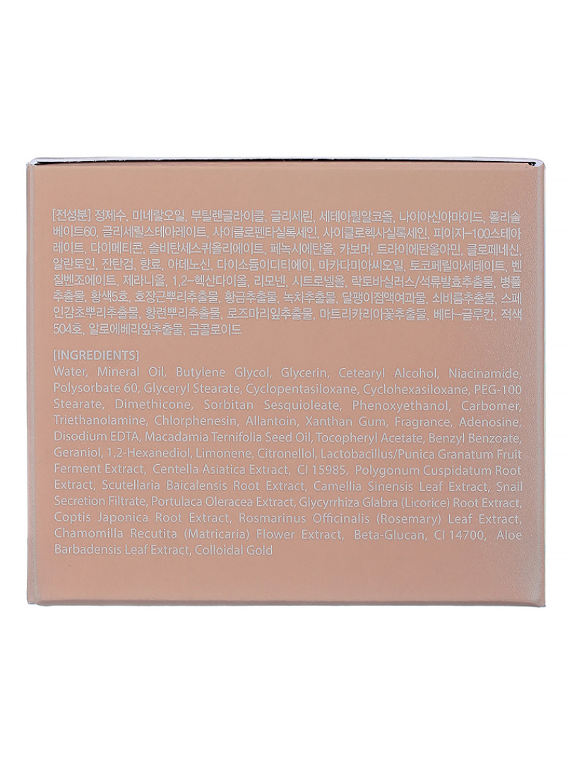 Water, Mineral Oil, Butylene Glycol, Glycerin, Cetearyl Alcohol, Niacinamide, Polysorbate 60, Glyceryl Stearate, Cyclopentasiloxane, Cyclohexasiloxane, PEG-100 Stearate, Dimethicone, Sorbitan Sesquioleate, Phenoxyethanol, Carbomer, Triethanolamine, Chlorphenesin, Allantoin, Xanthan Gum, Fragrance, Adenosine, Disodium EDTA, Macadamia Ternifolia Seed Oil, Tocopheryl Acetate, Benzyl Benzoate, Geraniol, 1,2-Hexanediol, Limonene, Citronellol, Lactobacillus/Punica Granatum Fruit Ferment Extract, Centella Asiatica Extract, CI 15985, Polygonum Cuspidatum Root Extract, Scutellaria Baicalensis Root Extract, Camellia Sinensis Leaf Extract, Snail Secretion Filtrate, Portulaca Oleracea Extract, Glycyrrhiza Glabra (Licorice) Root Extract, Coptis Japonica Root Extract, Rosmarinus Officinalis (Rosemary) Leaf Extract, Chamomilla Recutita (Matricaria) Flower Extract, Beta-Glucan, CI 14700, Aloe Barbadensis Leaf Extract, Colloidal Gold