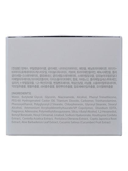 Water, Butylene Glycol, Glycerin, Niacinamide, Alcohol, Phenyl Trimethicone, PEG-60 Hydrogenated Castor Oil, Titanium Dioxide, Carbomer, Triethanolamine, Phenoxyethanol, Polyglyceryl-2 Stearate, Chlorphenesin, Glyceryl Stearate, Stearyl Alcohol, Ammonium Acryloyldimethyltaurate/VP Copolymer, Disodium EDTA, Fragrance, Adenosine, Polymethylsilsesquioxane, Silica, t-Butyl Alcohol, 1,2-Hexanediol, Benzyl Benzoate, Hexyl Cinnamal, Linalool, Sodium Hyaluronate, Houttuynia Cordata Extract, Centella Asiatica Extract, Portulaca Oleracea Extract, Coptis Japonica Root Extract, Aloe Barbadensis Leaf Extract, Cucumis Sativus (Cucumber) Fruit Extract