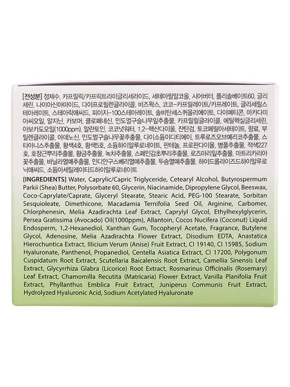 Water, Caprylic/Capric Triglyceride, Cetearyl Alcohol, Butyrospermum Parkii (Shea) Butter, Polysorbate 60, Glycerin, Niacinamide, Dipropylene Glycol, Beeswax, Coco-Caprylate/Caprate, Glyceryl Stearate, Stearic Acid, PEG-100 Stearate, Sorbitan Sesquioleate, Dimethicone, Macadamia Ternifolia Seed Oil, Arginine, Carbomer, Chlorphenesin, Melia Azadirachta Leaf Extract, Caprylyl Glycol, Ethylhexylglycerin, Persea Gratissima (Avocado) Oil(1000ppm), Allantoin, Cocos Nucifera (Coconut) Liquid Endosperm, 1,2-Hexanediol, Xanthan Gum, Tocopheryl Acetate, Fragrance, Butylene Glycol, Adenosine, Melia Azadirachta Flower Extract, Disodium EDTA, Anastatica Hierochuntica Extract, Illicium Verum (Anise) Fruit Extract, CI 19140, CI 15985, Sodium Hyaluronate, Panthenol, Propanediol, Centella Asiatica Extract, CI 17200, Polygonum Cuspidatum Root Extract, Scutellaria Baicalensis Root Extract, Camellia Sinensis Leaf Extract, Glycyrrhiza Glabra (Licorice) Root Extract, Rosmarinus Officinalis (Rosemary) Leaf Extract, Chamomilla Recutita (Matricaria) Flower Extract, Vanilla Planifolia Fruit Extract, Phyllanthus Emblica Fruit Extract, Juniperus Communis Fruit Extract, Hydrolyzed Hyaluronic Acid, Sodium Acetylated Hyaluronate