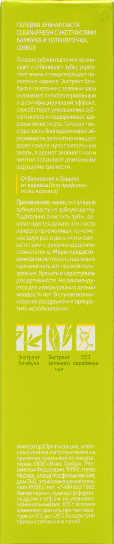Гелевая зубная паста мягко очищает и отбеливает зубы, укрепляет эмаль и предотвращает появление кариеса. Экстракт бамбука в сочетании с зеленым чаем оказывает антибактериальный и дезинфицирующий эффект, способствует уменьшению зубного налета и поддерживает здоровье полости рта. Гелевая текстура пасты благодаря низкой абразивности деликатно очищает даже самую чувствительную эмаль, а аромат зеленого чая и ментол оставляют длительное ощущение свежести. Способ применения: нанести гелевую зубную пасту на зубную щетку. Тщательно очистить зубы, рекомендуется делать это после каждого приема пищи, но не менее двух раз в день или в соответствии с рекомендациями стоматолога.