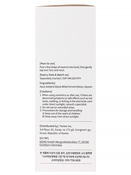 Изготовитель: Parket Inc., 3rd floor, 65, Eonju-ro 218-gil, Gangnam-gu, Seoul, Республика Корея. Восстанавливающая эссенция с бифидобактериями на основе помогает нормализовать естественный баланс кожи, снижает чувствительность за счет укрепления защитных функций кожи, не дает влаги испариться, насыщает кожу питательными веществами. Кроме того, способствует отшелушиванию ороговевших клеток, помогает выровнять текстуру кожного покрова. Способ применения: нанесите небольшое количество эссенции на очищенную и тонизированную кожу подушечками пальцев или с помощью ватного диска.
