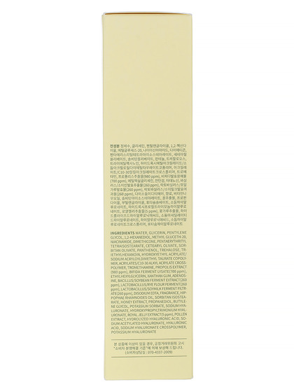 Water, Glycerin, Pentylene Glycol, 1,2-Hexanediol, Methyl Gluceth-20, Niacinamide, Dimethicone, Pentaerythrityl Tetraisostearate, Cetearyl Olivate, Sorbitan Olivate, Panthenol, Trehalose, Triethylhexanoin, Hydroxyethyl Acrylate/Sodium Acryloyldimethyl Taurate Copolymer, Acrylates/C10-30 Alkyl Acrylate Crosspolymer, Tromethamine, Propolis Extract, Bifida Ferment Lysate, Ethylhexylglycerin, Xanthan Gum, Adenosine, Bacillus/Soybean Ferment Extract, Lactobacillus/Rye Flour Ferment, Lactobacillus/Soymilk Ferment Filtrate, Disodium Edta, Hippophae Rhamnoides Oil, Sorbitan Isostearate, Honey Extract, Propanediol, Butylene Glycol, Potassium Sorbate, Sodium Hyaluronate, Hydroxypropyltrimonium Hyaluronate, Royal Jelly Extract, Pollen Extract, Hydrolyzed Hyaluronic Acid, Sodium Acetylated Hyaluronate, Hyaluronic Acid, Sodium Hyaluronate Crosspolymer, Potassium Hyaluronate, Fragrance