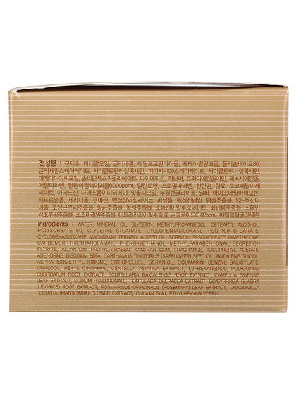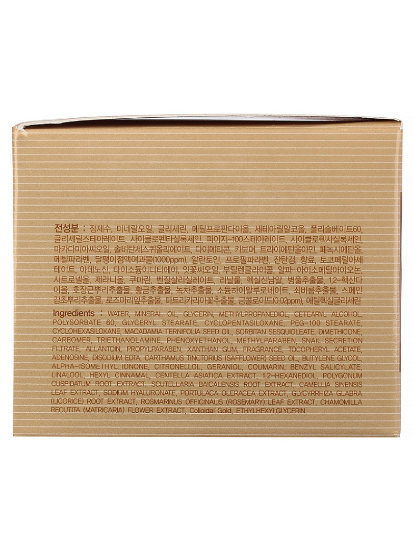 Water, Mineral Oil, Glycerin, Methylpropanediol, Cetearyl Alcohol, Polysorbate 60, Cyclopentasiloxane, Glyceryl Stearate, PEG-100 Stearate, Cyclohexasiloxane, Sorbitan Sesquioleate, Macadamia Integrifolia Seed Oil, Dimethicone, Carbomer, Triethanolamine, Methylparaben, Phenoxyethanol, Allantoin, Propylparaben, Snail Secretion Filtrate, Fragrance, Xanthan Gum, Tocopheryl Acetate, Adenosine, Disodium EDTA, Colloidal Gold, Carthamus Tinctorius (Safflower) Seed Oil, Portulaca Oleracea Extract, Sodium Hyaluronate, Butylene Glycol, Centella Asiatica Extract, Polygonum Cuspidatum Root Extract, Scutellaria Baicalensis Root Extract, Camellia Sinensis Leaf Extract, Glycyrrhiza Glabra (Licorice) Root Extract, Chamomilla Recutita (Matricaria) Flower Extract, Rosmarinus Officinalis (Rosemary) Leaf Extract, Alpha-Isomethyl Ionone, Benzyl Salicylate, Citronellol, Coumarin, Geraniol, Hexyl Cinnamal, Linalool