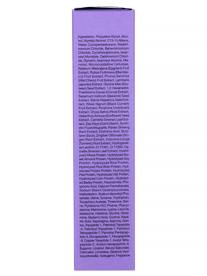 Propylene Glycol, Alcohol, Water, Myristyl Alcohol, C13-15 Alkane, Cyclopentasiloxane, Cyclohexasiloxane, Steartrimonium Chloride, Cetrimonium Chloride, Behentrimonium Chloride, Isopropyl Alcohol, Isopropyl Myristate, "Solanum Melongena (Eggplant) Fruit, Extract", Laminaria Japonica Extract, "Rubus Fruticosus (Blackberry) Fruit, Extract", "Prunus Serotina (Wild Cherry) Fruit, Extract", "Ribes Nigrum (Black Currant) Fruit, Extract", "Sesamum Indicum (Sesame) Seed, Extract", Oryza Sativa (Rice) Extract, Salvia Hispanica Seed Extract, "Helianthus Annuus (Sunflower) Seed, Extract", Theobroma Cacao (Cocoa) Extract, Glycine Max (Soybean) Seed Extract, Porphyra Umbilicalis Extract, Camellia Sinensis Leaf Extract, 1,2-Hexanediol, Hexapeptide-9, Palmitoyl Pentapeptide-4, Palmitoyl Tripeptide-5, Palmitoyl Tripeptide-1, Palmitoyl Tetrapeptide-7, Tripeptide-1, Copper Tripeptide-1, Acetyl Hexapeptide-8, Acetyl Tetrapeptide-2, Nonapeptide-1, Glycerin, Arginine, Leucine, Tryptophan, Lysine, Isoleucine, Threonine, Methionine, Histidine, Asparagine, Alanine, Proline, Glutamic Acid, Glutamine, Glycine, Valine, Phenylalanine, Aspartic Acid, Tyrosine, Serine, Cystine, Hydrolyzed Barley Protein, Hydrolyzed Corn Protein, Hydrolyzed Potato Protein, Hydrolyzed Rice Protein, Hydrolyzed Rice Bran Protein, Hydrolyzed Soy Protein, Hydrolyzed Oat Protein, Hydrolyzed Pea Protein, Hydrolyzed Wheat Protein, Hydrolyzed Sweet Almond Protein, "Zingiber Officinale (Ginger) Root, Extract", "Curcuma Longa (Turmeric) Root, Extract", Butylene Glycol, Panax Ginseng Root Extract, Mannitol, Microcrystalline Cellulose, Zea Mays (Corn) Starch, Synthetic Fluorphlogopite, CI 77491, Hydrogenated Lecithin, Niacinamide, Calcium Pantothenate, Maltodextrin, Sodium Starch Octenylsuccinate, Sodium Ascorbyl Phosphate, Tocopheryl Acetate, Pyridoxine HCl, Etidronic Acid, Phosphoric Acid, Fragrance (Eugenol, Linalool), "Fragrance (Benzyl Salicylate, Citronellol, Limonene, Eugenol, Geraniol, Hydroxycitronellal,, Isoeugenol, Linalool)