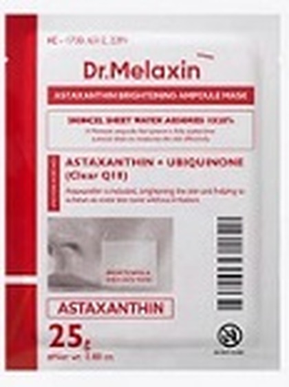 Изготовитель: BRAND 501 Co., Ltd., Республика Корея, 20 Achasan‑ro 9‑gil, Seongdong‑gu, Seoul. Маска Astaxanthin Ampoule Mask содержит астаксантин (100 000 ppm) и коэнзим Q10, которые насыщают кожу эссенцией, придавая ей сияние, выравнивая тон и помогая бороться с признаками старения. Маска выполнена из веганской сертифицированной ткани с высокой впитываемостью (1026 %), что обеспечивает глубокое проникновение активных компонентов. В составе средства — астаксантин, коэнзим Q10, ниацинамид, аденозин, витамин C, гидролизованный экстракт гардении флорида (Gardenia florida), транексамовая кислота. Продукт гипоаллергенен, прошёл дерматологические испытания и подходит для кожи с пигментными пятнами, тусклым тоном и первыми признаками старения. Способ применения: на очищенную и тонизированную кожу лица нанести маску на 10-20 минут, остатки эссенции распределить по коже лица