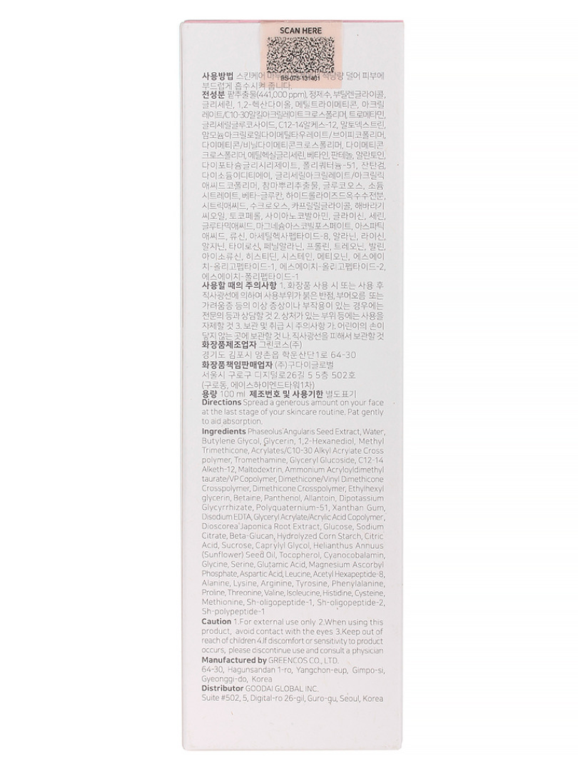 Изг-ль: GREENCOS CO., LTD. 64-30 Hagunsan dan 1-ro, Yangchon-eup, Gimpo-si, Gyeonggi-do, Республика Корея. Увлажняющий гель для жирной кожи с красной фасолью - отличное средство для глубокого увлажнения, которое нормализует себовыделение и препятствует появлению жирного блеска. Гель приятно освежает, быстро впитывается, не утяжеляет. Формула, основанная на экстракте фасоли адзуки, содержит аргирелин, бета-глюкан, витамины C и B12, комплекс аминокислот, пантенол и аллантоин. Способ применения: нанесите горошинку геля на лицо, распределите по коже лёгкими похлопывающими движениями.