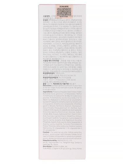 Phaseolus Angularis Seed Extract, Water,Butylene Glycal, Glycerin, 1,2-Hexanediol, Methyl Trimethicone, Acrylates/C10:30 Alkyl Acrylate Cross polymer, Tromethamine, Glyceryl Glucoside, C12-14 Alketh-12, Maltodextrin, Ammonium Acryloyidimethyl taurate/VP Copolymer, Dimethicone/Vinyl Dimethicone Crosspolymer, Dimethicone Crosspalymer, Ethylhexy! glycerin, Betaine, Panthenol, Allantoin, Dipotassium Glycyrrhizate, Polyquaternium-51, Xanthan Gum, Disodium EDTA, Glyceryl Acrylate/Acrylic Acid Copolymer, Dioscorea Japonica Root Extract, Glucose, Sodium Citrate, Beta-Glucan, Hydrolyzed Corn Starch, Citric Acid, Sucrose, Caprylyl Glycol, Helianthus Annuus (Sunflower) Seed Oil, Tocopheral, Cyanocobalamin, Glycine, Serine, Glutamic Acid, Magnesium Ascorbyl Phosphate, Aspartic Acid, Leucine, Acetyl Hexapeptide- 8, Alanine, Lysine, Arginine, Tyrosine, Phenylalanine, Proline, Threonine, Valine, Isoleucine, Histidine, Cysteine, Methionine, Sh-oligopeptide-1, Sh-oligopeptide-2, Sh-polypeptide-1