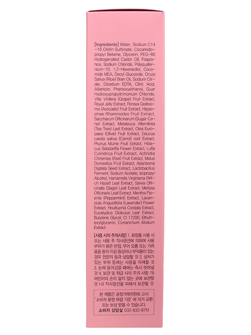 Water, Sodium C14-16 Olefin Sulfonate, Cocamidopropyl Betaine, Glycerin, PEG-60 Hydrogenated Castor Oil, Fragrance (Hexyl Cinnamal, Linalool), Sodium Chloride, Polyquaternium-10, 1,2-Hexanediol, Cocamide MEA, Decyl Glucoside, Oryza Sativa (Rice) Bran Oil, Sodium Citrate, Phenoxyethanol, Disodium EDTA, Citric Acid, Allantoin, Guar Hydroxypropyltrimonium Chloride, Houttuynia Cordata Extract, Sophora Flavescens Root Extract, Scutellaria Baicalensis Root Extract, Polygonum Multiflorum Root Extract, Glycyrrhiza Uralensis (Licorice) Root Extract, Centella Asiatica Extract, Angelica Gigas Root Extract, Swertia Japonica Extract, Portulaca Oleracea Extract