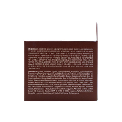 Water, Mineral Oil, Glycerin, Dipropylene Glycol, Niacinamide, Cyclopentasiloxane, Beeswax, Caprylic/Capric Triglyceride, Cetyl Ethylhexanoate, Cetearyl Alcohol, Polysorbate 60, Dimethicone, Helianthus Annuus (Sunflower) Seed Oil, Betaine, Macadamia Ternifolia Seed Oil, Cyclohexasiloxane, Simmondsia Chinensis (Jojoba) Seed Oil, Sorbian Stearate, Sodium Acryloyldimethyl Taurate Copolymer, Isohexadecane, Polysorbate 80, Sodium Polyacrylate, Paeonia Lactiflora Root Extract, Convallaria Majalis Extract, Magnolia Liliflora Flower Extract, Lilium Candidum Flower Extract, Beta-Glucan, Sodium Hyaluronate, Hydrolyzed Collagen, Glyceryl Stearate, PEG-100 Stearate, Phenoxyethanol, Chlorphenesin, Carbomer, Allantoin, Arginine, Tocopheryl Acetate, Snail Secretion Filtrate, Butylene Glycol, Ethylhexylglycerin, Adenosine, Centella Asiatica Extract, 1,2-Hexanediol, Disodium EDTA, CI 19140, CI 15985, Fragrance, Alpha-Isomethyl Ionone, Citronellol, Limonene, Hexyl Cinnamal, Linalool, Butylphenyl Methylpropional
