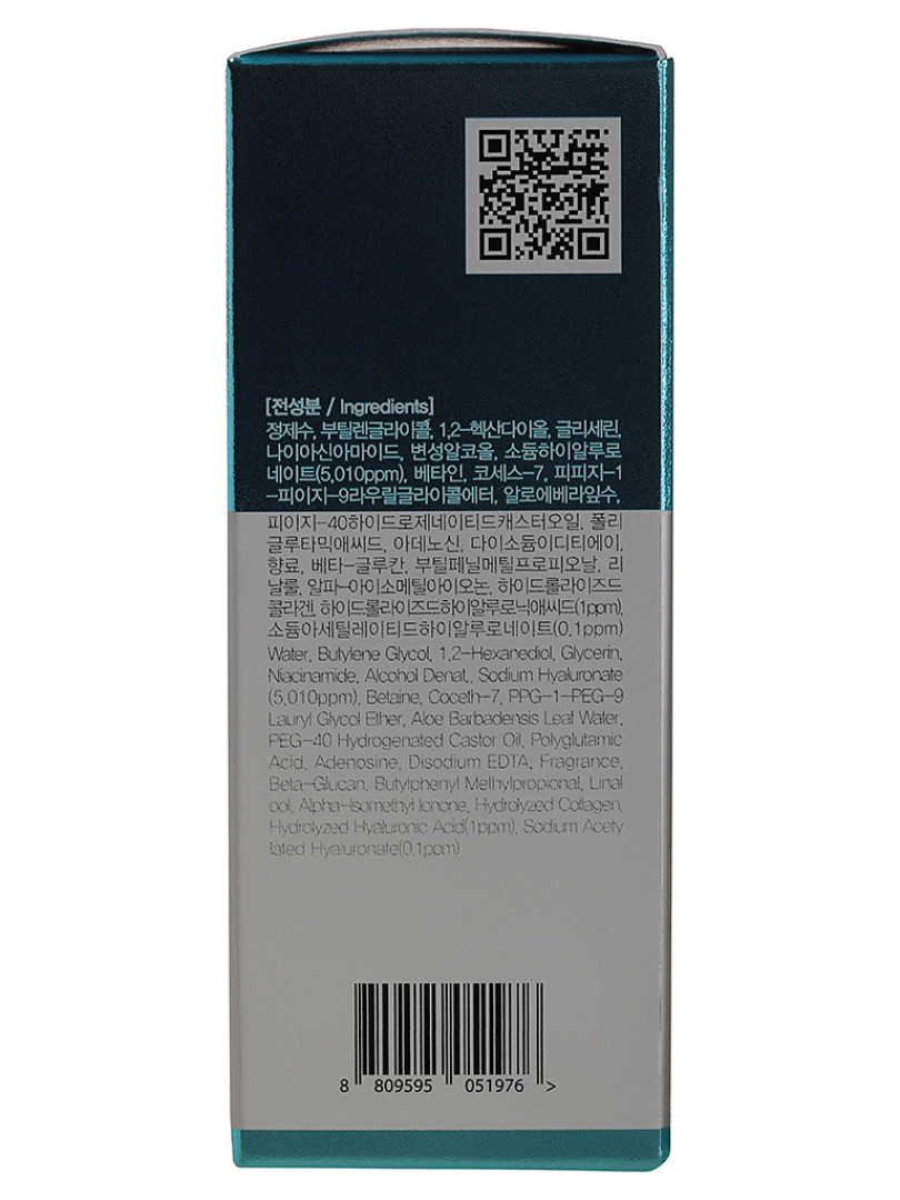 Water, Butylene Glycol, 1.2 – Hexanediol, Glycerin, Niacinamide, Alcohol Denat., Sodium Hyaluronate, Betaine, Coceth-7, PPG- 1- PEG- Lauryl Glycol Ether, Aloe Barbadensis Leaf Water, PEG-40 Hydrogenated Castor Oil, Polyglutamic Acid, Adenosine, Disodium ЕОТА, Fragrance, Beta-Glucan, Butylphenyl Methylpropional, Linalool, Alpha- lsomethyl lonone, Hydrolyzed Collagen, Hydrolyzed Hyaluronic Acid, Sodium Acetylated Hyaluronate.