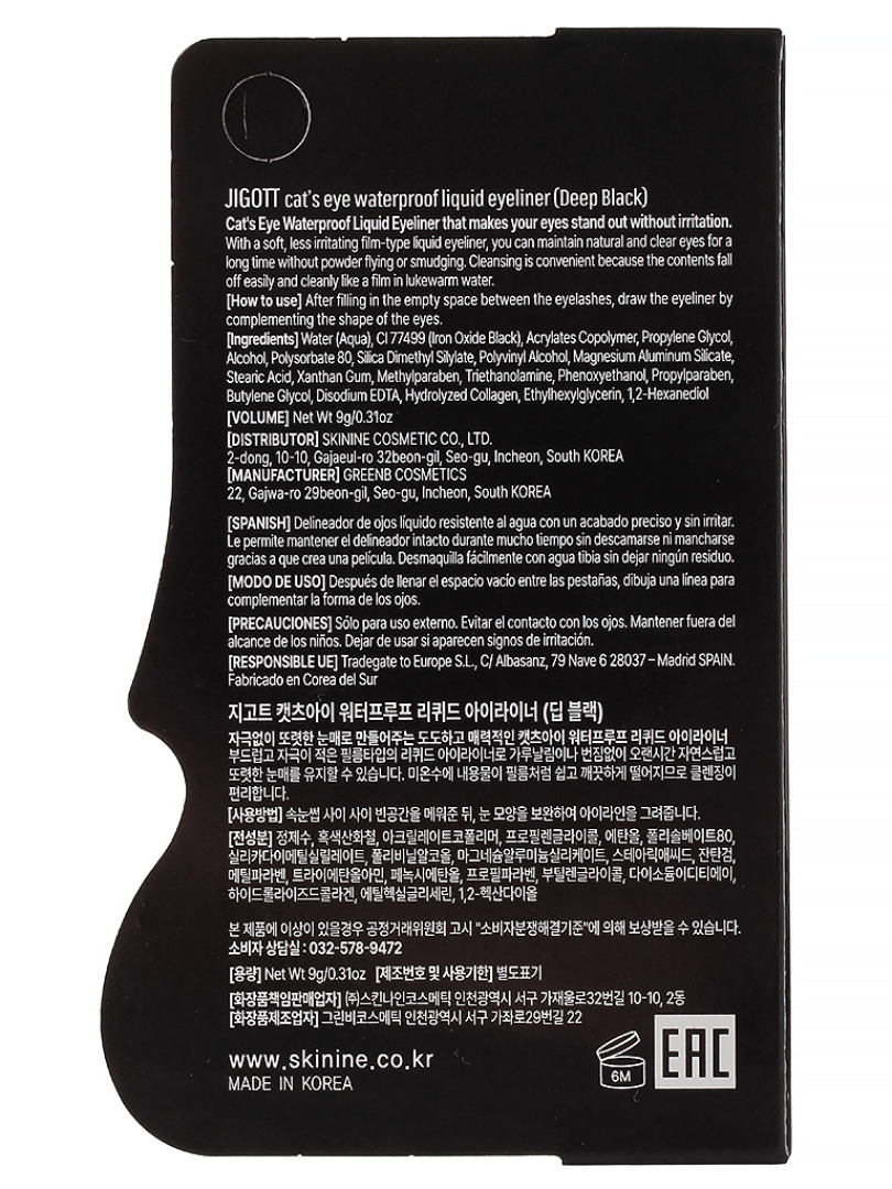 Изг-ль:Skinine Cosmetic Co., Ltd., Корея, Республика, 2-dong, 10-10, Gajaeul-ro, 32beon-gil, Seo-gu, Incheon.Jigott Cat's Eye Waterproof Liquid Eyeliner(Deep Black). Жидкая подводка для глаз с водостойкой формулой создает четкую и однородную линию пленочного типа, не растекается, не вызывает раздражений. Легко смывается в теплой воде. Цвет: глубокий черный. Способ применения: нанесите средство кистью поверх ресничной зоны верхнего века.