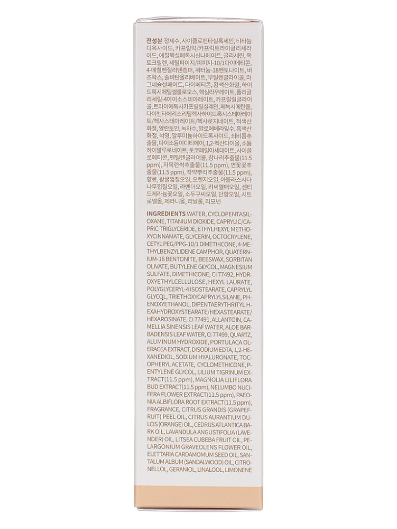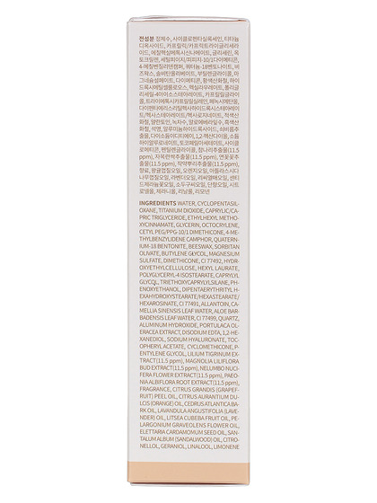 Water, caprylic/capric triglyceride , cyclopentasiloxane , titanium dioxide, ethylhexyl methoxycinnamate , glycerin, octocrylene, cetyl peg/ppg-10/1 dimethicone , 4-methylbenzylidene camphor , dimethicone, quaternium-18 bentonite, sorbitan olivate, beeswax, sodium hyaluronate,