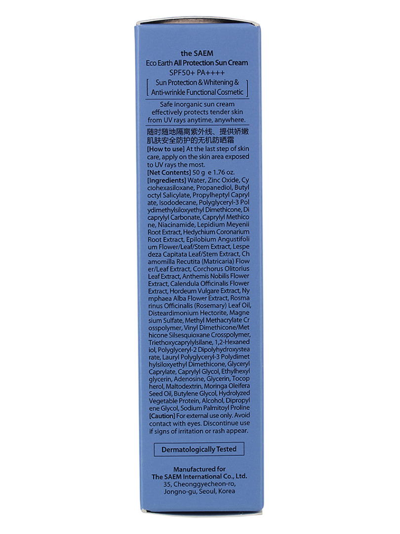 Изготовитель: THE SAEM INTERNATIONAL CO.LTD., КОРЕЯ, РЕСПУБЛИКА, 10F, 35, Cheonggyecheon-ro, Jongno-gu, Seoul. Солнцезащитный крем предназначен для надежной защиты от УФ-излучения кожи, особенно необходим очень светлой коже, а также для кожи с аллергическими реакциями. Благодаря солнцезащитному фильтру SPF50+ PA+++ эффективен в отношении UV-А и UV-B лучей. В составе крема уникальный комплекс натуральных экстрактов и масел, который предупреждает разрушение клеток, ускоряет их регенерацию. Способ применения: Наносить крем перед каждым выходом на открытое солнце. При длительном пребывании на солнце повторять нанесение. Уменьшение количества крема или неравномерное распределение значительно снизит уровень защиты.