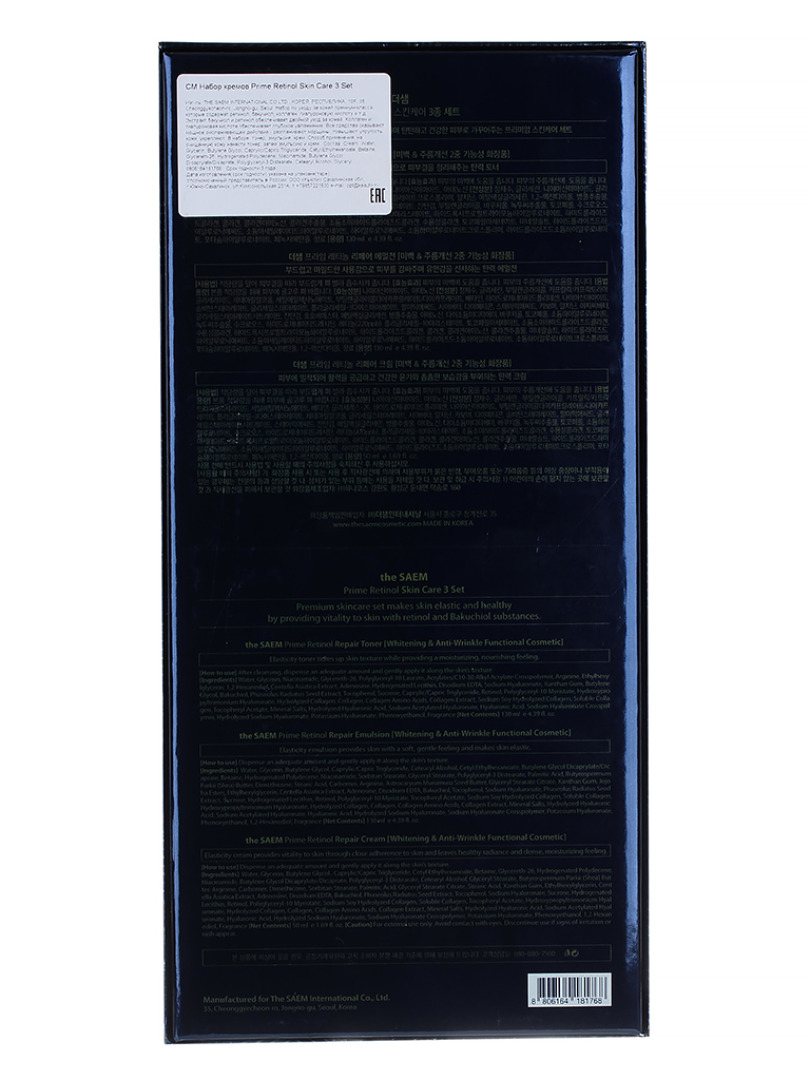 Изг-ль: THE SAEM INTERNATIONAL CO.LTD., КОРЕЯ, РЕСПУБЛИКА, 10F, 35, Cheonggyecheon-ro, Jongno-gu, Seoul. Набор по уходу за кожей премиум-класса, которые содержат ретинол, бакучиол, коллаген, гиалуроновую кислоту и т.д. Экстракт бакучиол и ретинол обеспечивает двойной уход за кожей. Коллаген и гиалуроновая кислота обеспечивает глубокое увлажнение. . В наборе: тонер, эмульсия, крем. Способ применения: на очищенную кожу нанести тонер, затем эмульсию и крем.