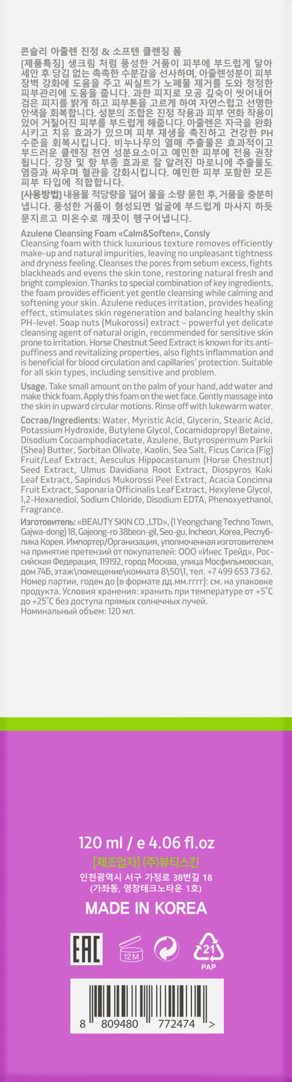 CNS FOAM Пенка для умывания успокаивающая с азуленом Azulene Cleansing Foam Calm&Soften, 120мл