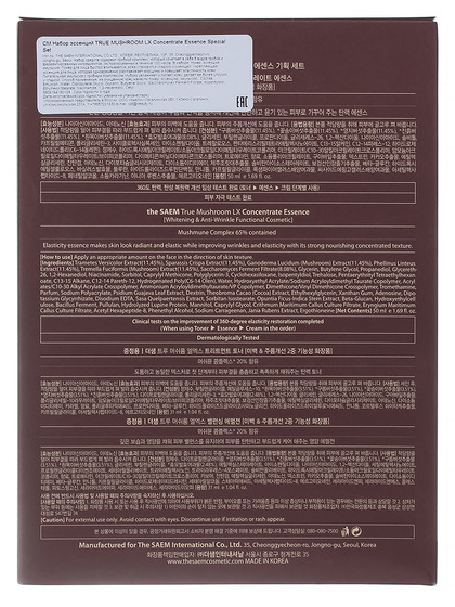 Изг-ль: THE SAEM INTERNATIONAL CO.LTD., КОРЕЯ, РЕСПУБЛИКА, 10F, 35, Cheonggyecheon-ro, Jongno-gu, Seoul. Набор средств содержит грибной комплекс, который сочетает в себе 5 видов грибов и ферментир.ингредиентов, экстрагированных в течение 100 часов. Тонер для лица быстро впитывается, кожа становится гладкой и сияющей. Укрепляющая эссенция для лица, разглаживает морщины и повышает эластичность кожи. Питательная эмульсия увлажняет. Способ применения: на очищенную кожу нанести тонер, эссенцию, эмульсию.